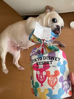 ちなさんからのラブレター付きお土産を、自分へのプレゼントと思い込んで腰抜かして喜ぶ犬